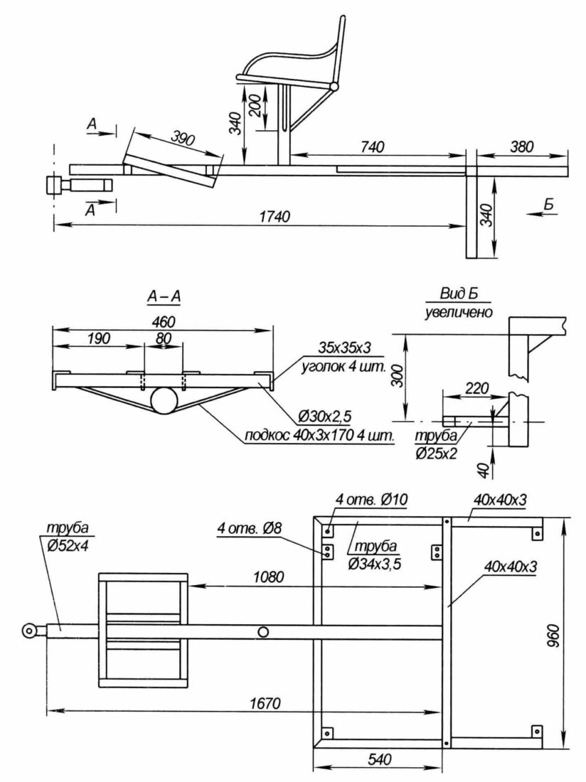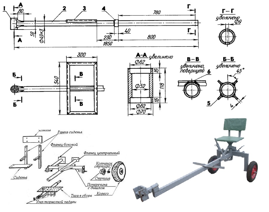 На ней должны быть предусмотрены степени нагрузки разных частей рамы, а также общие размеры устройства. Заняться этим можно самостоятельно, а можно воспользоваться чертежами тех, кто уже с успехом осуществил сборку самодельного адаптера.