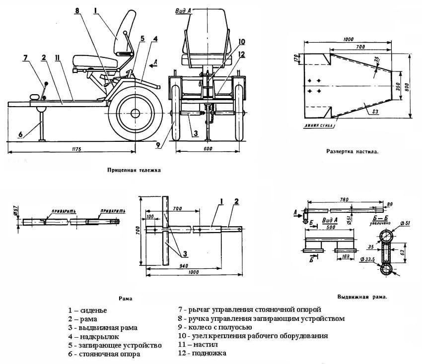- Сиденье от любой техники, стальной лист для опорной части, педали, рукоятка тормоза. Подбирать комплектующие по чертежу.