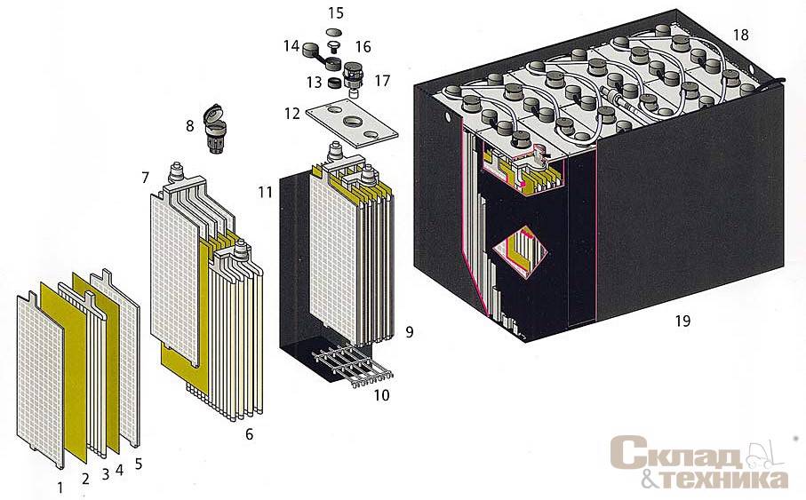 Устройство АКБ зависит от типа батареи. На российском рынке представлены следующие типы тяговых АКБ: