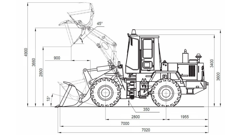 | Выход кромки ковша при максимальной высоте подъема и угле выгрузки 45°, мм | 900 |