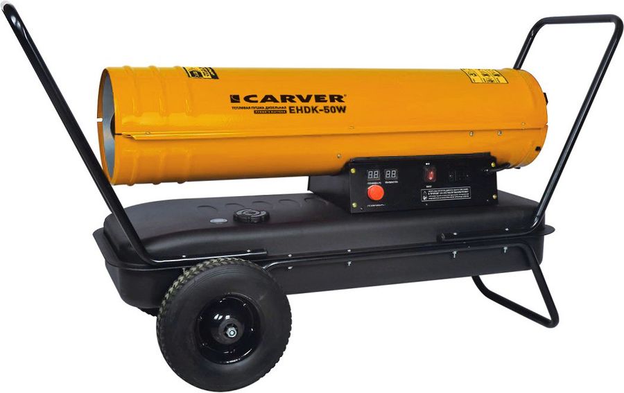 Carver EHDK-50W с 45-литровым баком проработает без дозаправки примерно 91, часа. Ее мощность – 50 кВт, а производительность – до 1239 кубометров горячего воздуха в час.