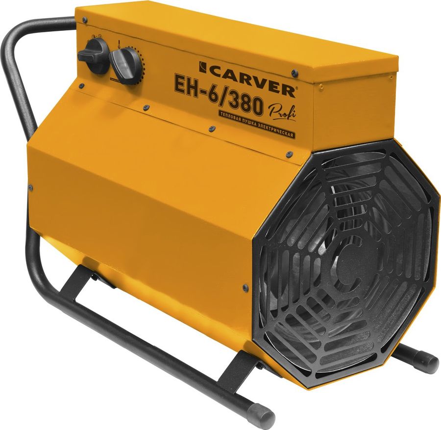 Электрическая тепловая пушка Carver ЕН-6/380 Profi, сконструированная по тому же принципу, более мощная. Она тоже работает в двух режимах, но вы выбираете уже между 4 и 6 кВт, поэтому устройство можно использовать для обогрева жилых и рабочих помещений площадью до 60 кв. м. Соответственно, вес и габариты тоже увеличились. Эта модель весит 10 кг, а ее размеры составляют 530 х 290 х 415 мм.