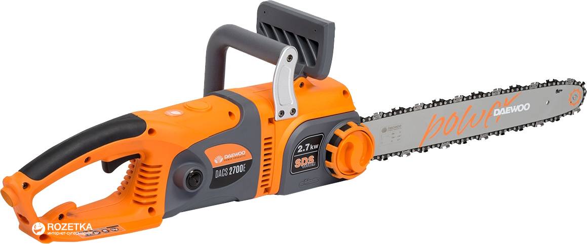 Как и в прошлой модели, в Дэу 2700Е встроены системы автоматической смазки цепи во время работы и плавного старта. А благодаря небольшому окошку, стало намного легче контролировать наличие и уровень масла в инструменте. Многочисленные отзывы о данной модели Daewoo говорят о том, что она более популярна, чем ее предшественница.
