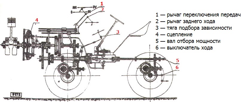 При помощи шарнирного и сквозного валов крутящий момент от приводного вала передается передней коробке передач и задней. Для включения оборотов приводного вала есть ручной рычаг, он к тому же снабжен предохранителем от случайного запуска мотора.