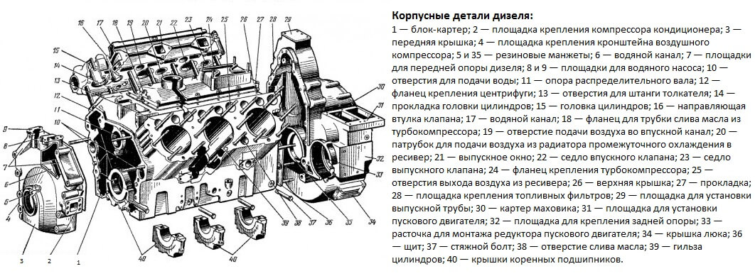Маховик чугунный, весом в 60 кг. Кулачковый вал механизма газораспределения – один на оба ряда цилиндров. Расположен в блок-картере. Привод вала механизма газораспределения – шестерёнчатый. Масло двигателя проходит и через турбокомпрессор, охлаждается в радиаторе, расположенном спереди.