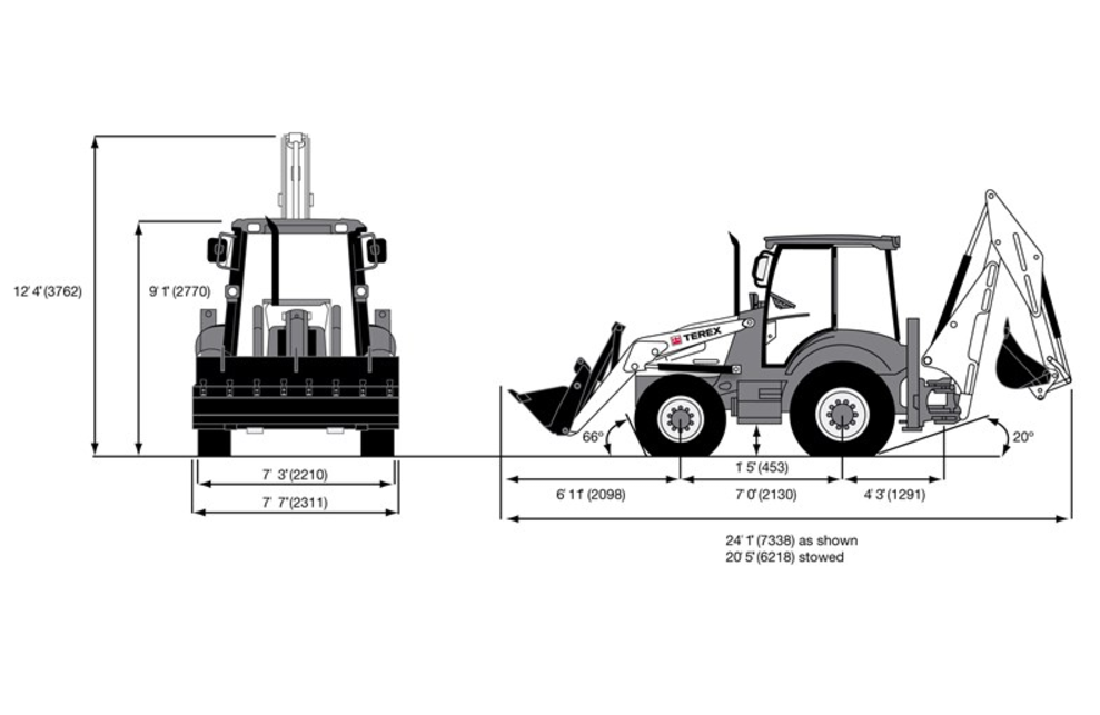 Экскаватор-погрузчик Terex 860 имеет двигатель мощностью 74,5 кВт (100 л.с.), имеет массу 7370 кг и габаритные размеры:
