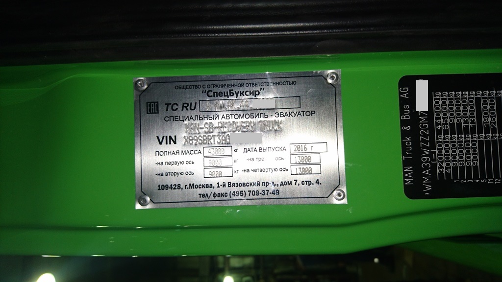 Транспортное средство изготавливается на территории Таможенного союза (Российская Федерация) для эвакуации транспортных средств на базе шасси MAN TGS 41.480, 8х4