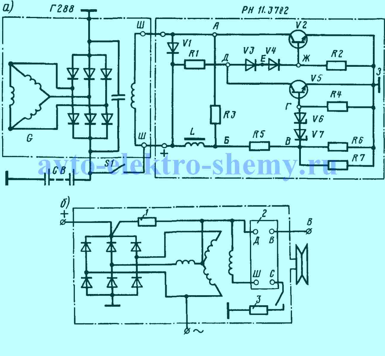 Рис. 4. Электрическая принципиальная схема генераторной установки переменного тока: а — генератор Г288 с реле-регулятором 11.3702; б — генератор Г273В с реле-регулятором Я120; 1 — резистор; 2 — реле-регулятор Я120М; 3 — резистор сезонной регулировки
