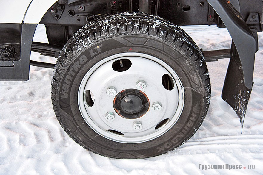 В сравнении с Hyundai Porter малотоннажник HD 35City выглядит игроком следующего размерного класса. Однако не спешите с выводами. Новинка базируется на усиленной раме Porter, а крупнее своего предшественника кажется главным образом из-за кабины, заимствованной у автомобилей сегмента HD35 и HD45. На то, что HD 35City ведет родословную от Porter, намекают и шины ведущего моста размерностью 13 дюймов – дань удобству погрузки и выгрузки. Правда, в отличие от Porter задние шины героя этого теста имеют двускатную конфигурацию. Спереди же установлены «взрослые» односкатные колеса размерностью 205/65R16.