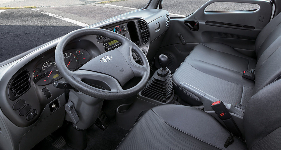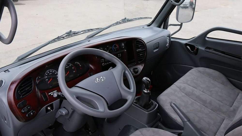 Перед водителем Hyundai HD35 расположился 4-спицевый руль, который имеет механическую регулировку по наклону в широком диапазоне. Сразу за рулем установлена простая, легкочитаемая приборная панель. На центральной части торпедо расположились основные органы управления и воздуховоды, а сама торпеда развернута к водителю. Тоннеля как такового нет, но все свободное расстояние между сиденьями заполняет ручка КПП и стояночный тормоз, который может выполнять роль подлокотника.