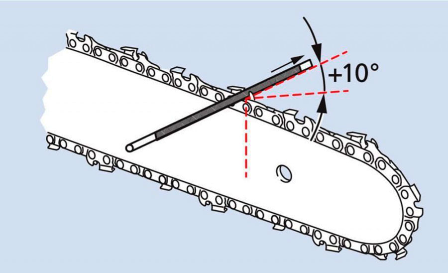 - В процессе заточки движения напильника осуществляются изнутри зуба к внешнему краю кромки, прокручивая напильник вокруг своей оси. При этом инструмент нужно двигать параллельно специальной метке, расположенной на цепи. Эта метка служит указателем правильного угла заточки режущей кромки. Для удобства самого процесса зуб, который вы обрабатываете, должен располагаться по центру шины.