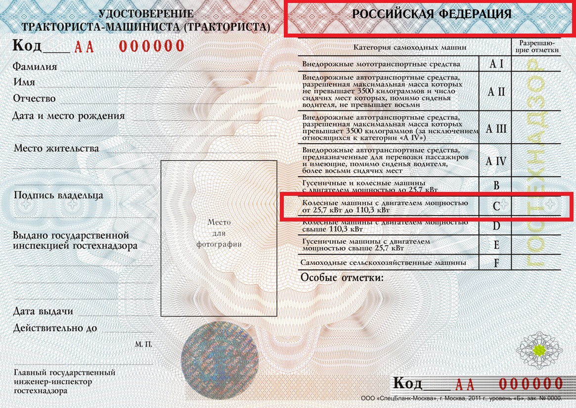 - Категория E.Удостоверение тракториста с правом управлять техникой мощностью до 25,7 кВт.