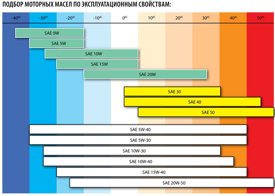 SAE классификация устанавливает регламент текучести и вязкости смазывающих материалов. По этой классификации они делятся на 11 главных категорий (5 летних от 20 до 60 и 6 зимних от 0W до 25W). Индекс из двух параметров будет указывать на всесезонность. Например, 10W-40 гарантирует безопасную работу двигателя при диапазоне температур от -30 до 40°С. Нужно учитывать, что чем больше две последних цифры, тем более густая консистенция смазки. А чем она гуще, тем хуже ее рабочие характеристики в зимний период.