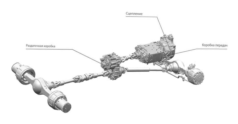 В отличие от стандартного устройства, переключающего скорость, данный механизм дополнительно обеспечивает передачи заднего и переднего хода. Сцепление в автомобиле двухдисковое, управляется особыми периферийными пружинами и функционирует по фрикционному типу. За запуск среднего и заднего моста отвечает карданная передача, состоящая из двух валов.