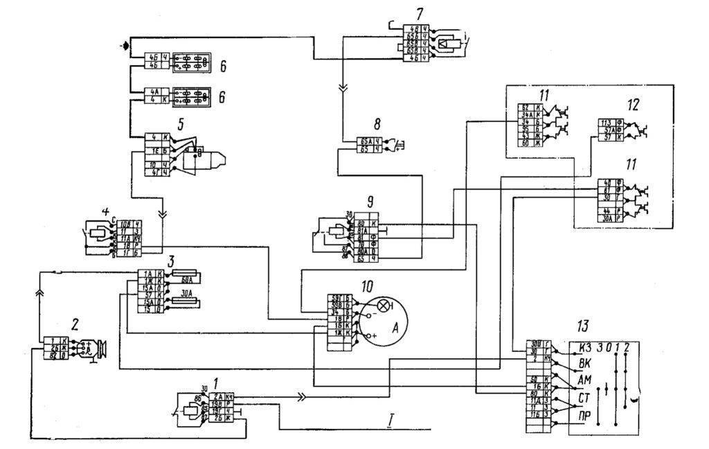 1 – реле отключения обмотки возбуждения генератора; 2 – генератор; 3 – блок предохранителей; 4 – реле стартера; 5 – стартер; 6 – батареи аккумуляторные; 7 – выключатель «массы»; 8 – кнопка дистанционного выключателя «массы» аккумуляторных батарей; 9 – реле электродвигателей отопителя; 10 – амперметр; 11 – предохранители 13.3722 (7.5 А); 12 – предохранитель ПР310 (10 А); 13 – выключатель приборов и стартера; I – к термореле ЭФУ.