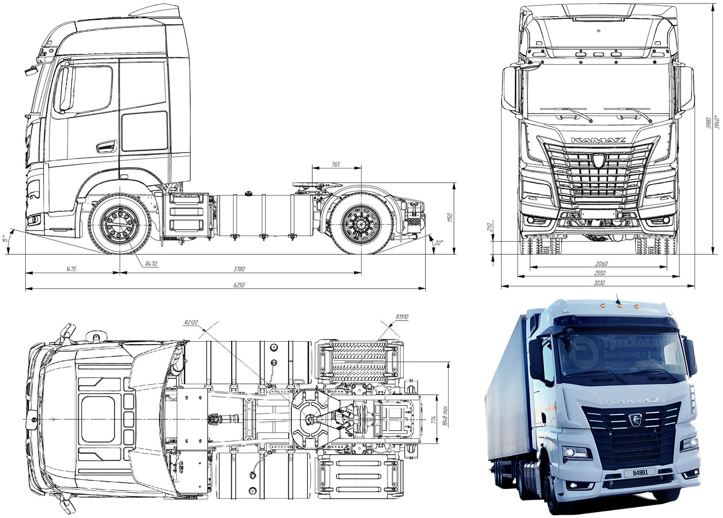 С двигателем КАМАЗ-910 агрегатирована новейшая коробка передач ZF Traxon с адаптивным роботизированным переключением ступеней. Емкость основного топливного бака тягача составляет 700 л, дополнительного – 500 л. Рама изготовлена из легких высокопрочных сталей.