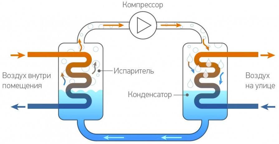 Жидкий фреон вскипает в испарителе, где давление низкое настолько, что парообразование происходит при температуре от +10°С до +18°С. При этом происходит отбор тепла у входящего воздуха. Нагретый парообразный фреон поступает в компрессор. Там давление повышенное, а следовательно, и температура кипения выше. Здесь фреоновый пар конденсируется в жидкость и возвращается в испаритель. Цикл повторяется бесконечно.