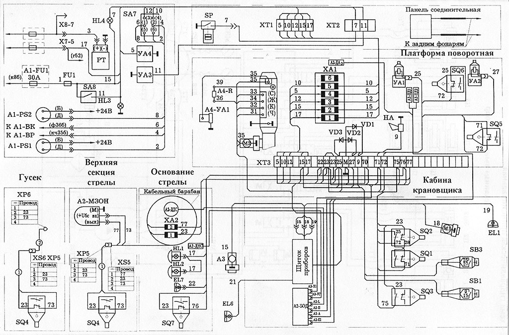 Электрооборудование автомобиля и крановой установки рассчитано на напряжение 24 В и состоит из приборов безопасности, освещения и сигнализации, а также контрольно-измерительных приборов.