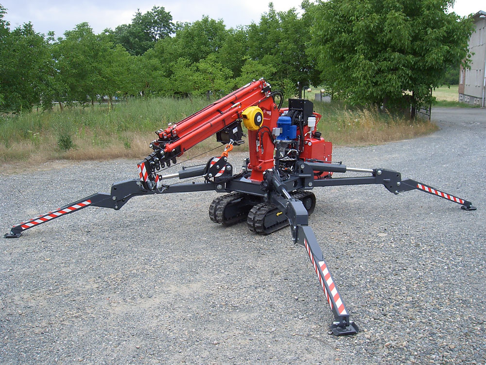 Мини-кран Spider характеризуется бензиновым типом двигателя, объем которого составляет от 250 до 1000 кубических сантиметров. Грузоподъемность будет зависеть от вылета стрелы, при минимальном вылете кран может поднять груз массой до трех тонн. При максимальном вылете стрелы вес груза будет значительно меньше, не более 500 кг. Кран-паук способен поднимать груз на высоту до 12 метров.