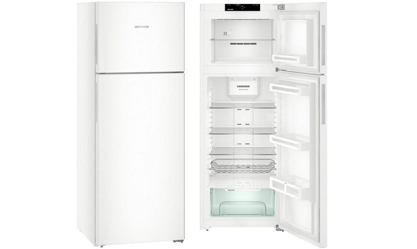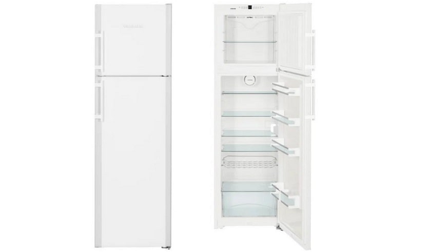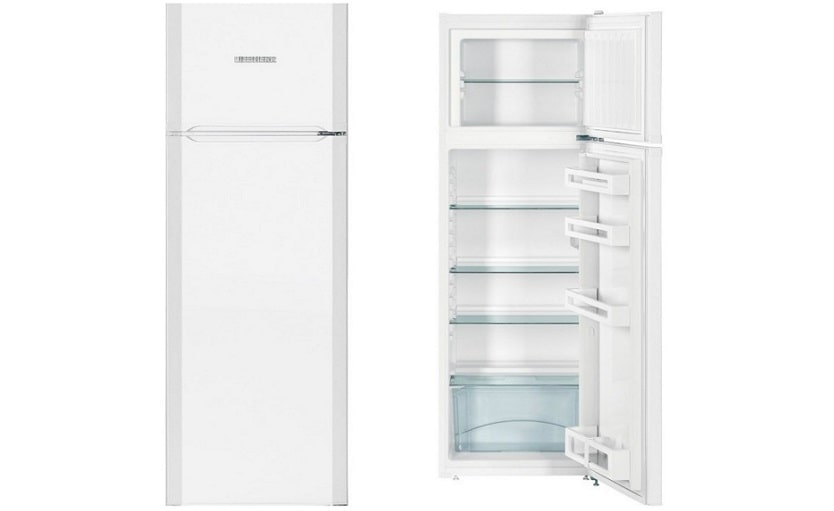 Если выбирать оборудование с морозилкой сверху, стоит рассмотреть Liebherr CTP 2921, стоимость которого составляет 21 тыс. рублей. Холодильник привычного белого цвета шириной 55 см, что удобно для малогабаритных квартир. Система размораживания ручная. Объем основного отсека составляет 220 л, морозилки – 52 л.
