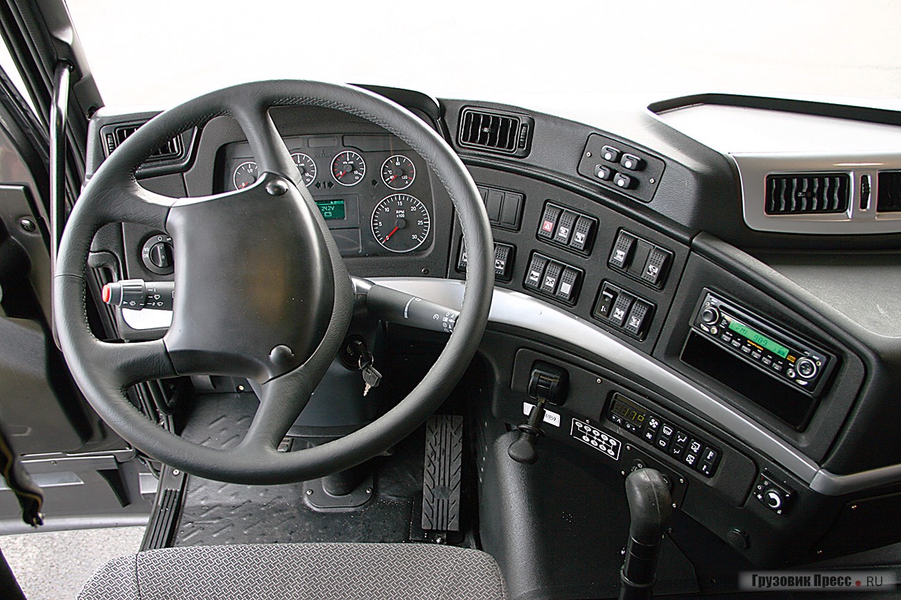 Внутреннее содержание кабины изменилось гораздо сильнее. Новая панель, знакомая читателям по тест-драйву МАЗ-6440РА, в бескапотной кабине смотрится ничуть не хуже. Даже моторный тоннель не портит этого впечатления. К тому же его высота не так уж велика и позволяет встать на нём практически в полный рост. Да и перемещаться по кабине вдвоем не сложно.
