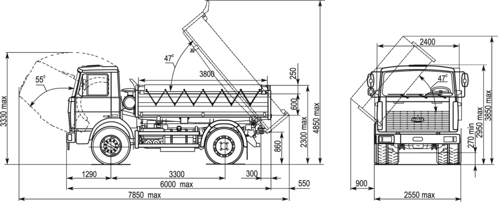 - ширина — 2500 мм (в моделях с выгрузкой на 3 стороны — 3450 при полностью опрокинутом кузове)