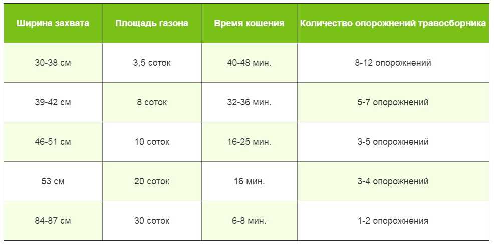 Таблица: производительность газонокосилки в зависимости от ширины захвата