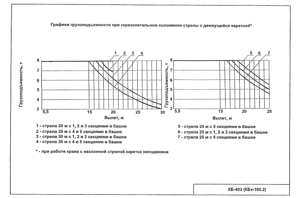 Графики грузоподъемности КБ-403 при горизонтальном положении стрелы