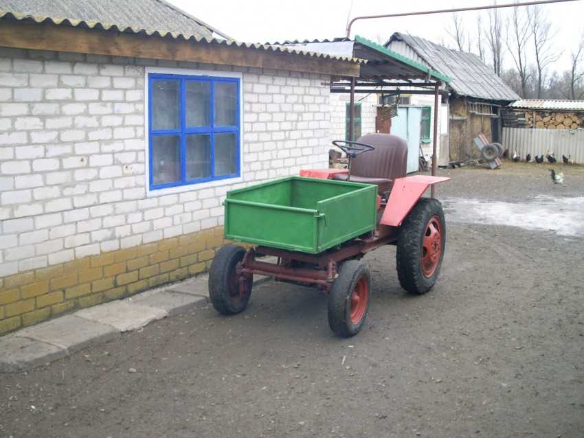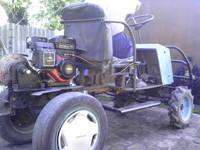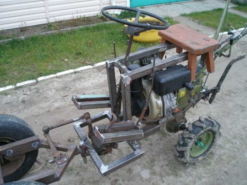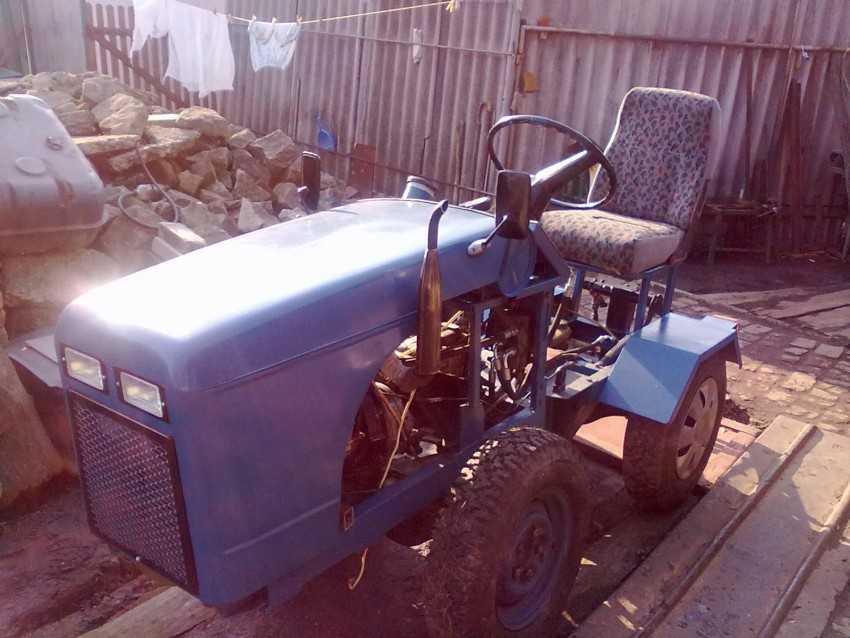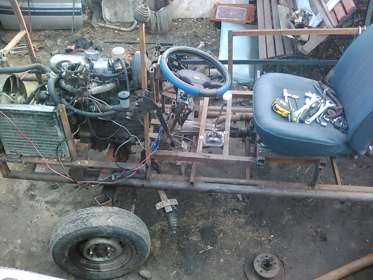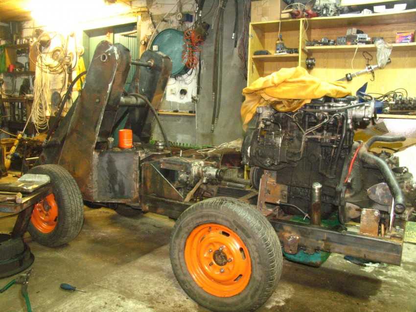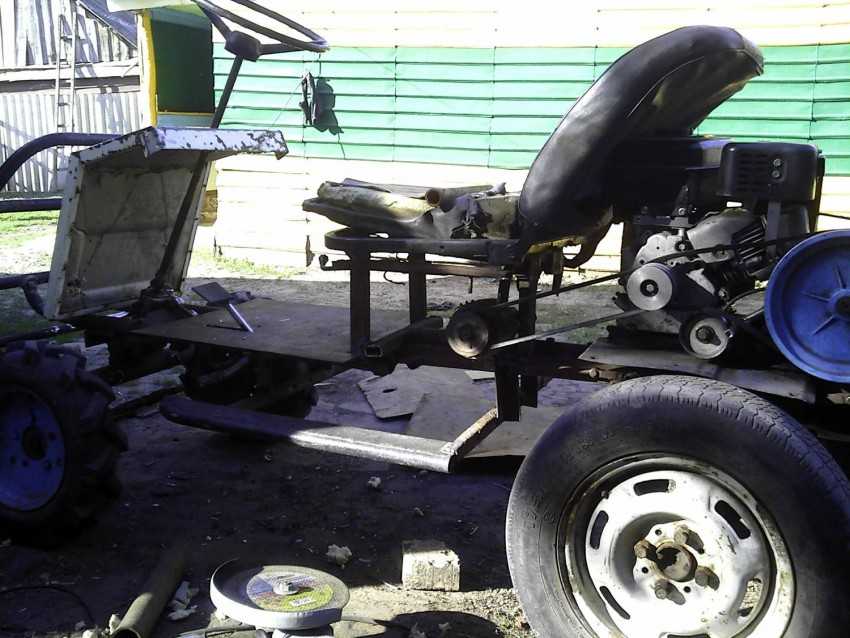 На этом этапе самодельный минитрактор переломка уже начинает быть похожим на те, что изображены на фото в разных источниках.