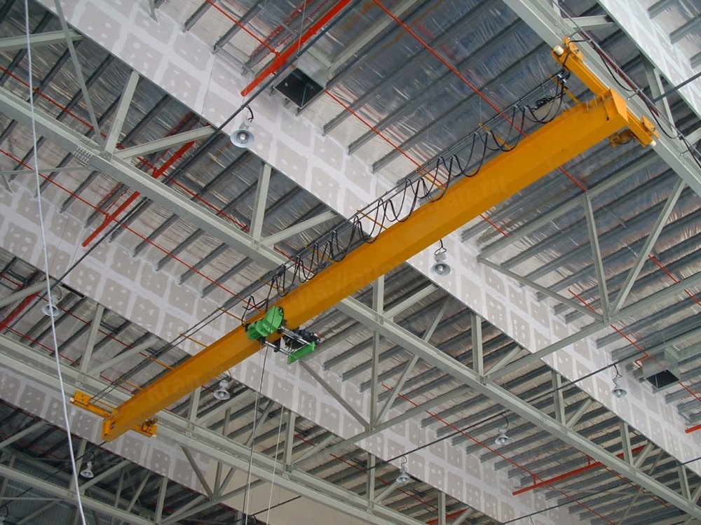 Кран мостовые однобалочные подвесные передвигаются по монорельсовым путям (изготовленных из двутаврового профиля) закрепленных на потолочных перекрытиях зданий, цехов или складах (поэтому их и называют подвесными).
