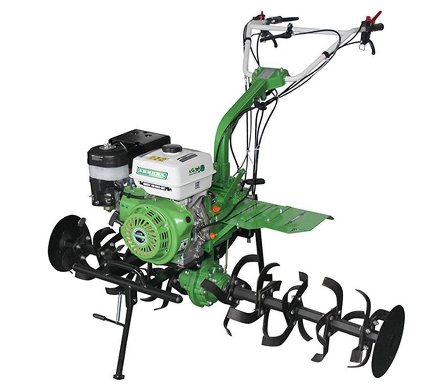 Компактный агрегат с габаритами 140×84×102 см оснащен четырехтактным бензиновым двигателем АЕ-7 с верхним расположением клапанов, аналогичным японскому HONDA GX 210. Мощность мотора – 7 л.с., что позволяет быстро и качественно провести вспашку участков площадью до 100 соток.