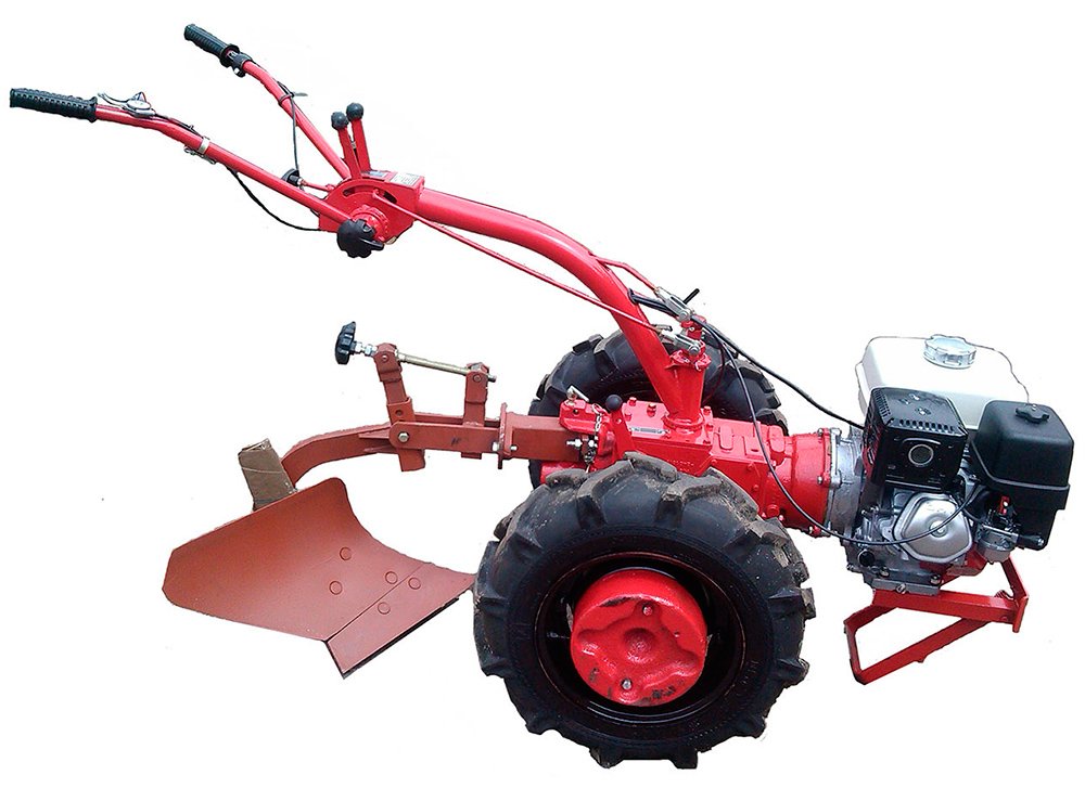 Купил на замену мб “Каскад”, которым пользовался с 1990-го года, так что есть с чем сравнивать. Преимущества тяжёлого мб очевидны и неоспоримы. Двигатель “Хонда” просто чудо, никаких нареканий за 3 года тяжёлой работы, силовая передача и ходовая часть отработаны и работают нормально, за исключением незначительных недостатков, а именно: нечёткое включение 1-й и 3-й передач и если 1-я передача практически не нужна (иногда пользуюсь при обработке почвы активной фрезой) , то 3-я является основной для вспашки и искать 1-ю и 3-ю передачи приходится долго. Более серьёзные недостатки имеются в управлении и навесных агрегатах, а именно: 1.- кнопка “стоп” развалилась за неделю, двигатель глушу касаясь проводом массы, что крайне неудобно; -ход рычага “сцепление” недостаточен для полного его выключения, при максимальной регулировке сцепление либо “ведёт”, либо буксует, что не здорово. обрезал резину на конце рукоятки, стало лучше, но, согласитесь, это не уровень! – усилие от рукояток на трубу передаётся через короб из тонкого металла, который треснул на всю ширину – пришлось подваривать усиление из квадрата 8 мм; – тот же тонкий металл протёрся в точке зацепления зуба дифференциала, что приводит к самопроизвольному его включению, а это уже опасно в транспортном режиме, (совершенно неожиданно невозможно повернуть). 2.- Плуг не продуман совершенно, видать “слизан” с тракторного. Его регулировка винтами мне не понравилась. МБ должен двигаться по прямой, изламывая осевую линию МБ- плуг (что предполагается по инструкции) заставляет мб вылезать из борозны, либо лезть на пахоту. Посмотрите, как регулируется ширина вспашки на конских плугах – перебрасывается кольцо в гребёнке, тем самым плуг перемещается правее (левее), меняя ширину вспашки. Далее, пахарь удерживает плуг вертикально, на МБ он жёстко связан с корпусом достаточно длинным рычагом, при качании корпуса мб плуг заметно виляет, борозна неровная и если её не исправить при следующем прогоне, вырастает “пузо”, так как колесо мб повторяет изгиб предыдущего прохода. Ещё в 90-м видел работу “забугорного” мотоблока – там лемех плуга располагался горизонтально, отвал перекидывался на любую сторону, все регулировки продуманы до мелочей. Друзья, может не стоит изобретать, который уже изобретён и прекрасно работает! С уважением.