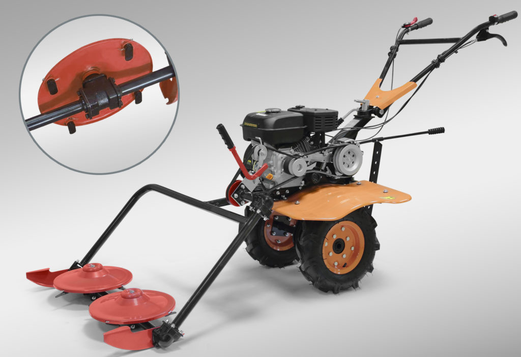 Мотор с верхним расположением клапанов прост в обслуживании. Мотоблок для вспашки имеет 4 скорости движения – 2 вперед и 2 назад. Легко проходит по рельефной поверхности, имея большие колеса. Для удобного пользования имеется рукоятка управления. Две фрезы выполняют свою работу качественно. Оператор защищён от вылетающих кусков земли прочными крыльями из листовой стали.