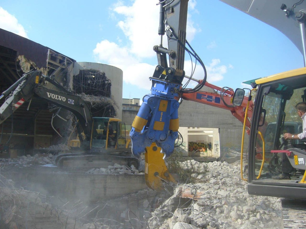 Оборудование применяют на работах демонтажного характера. Современные модели могут поворачиваться на 360 градусов, что делает их эффективнее и удобными в работе. Отечественные представители этого вида навесного оборудования несколько дешевле зарубежных, но мало уступает им в производительности и функциональности. Некоторые модели имеют сменные челюсти (так называемые мультипроцессорные ножницы). Тип работы предполагает быструю установку соответственных челюстей: позволяющих вести комбинированные работы, разрушительные ножницы (для железобетонных элементов), челюсти для разрезания металлического мусора.