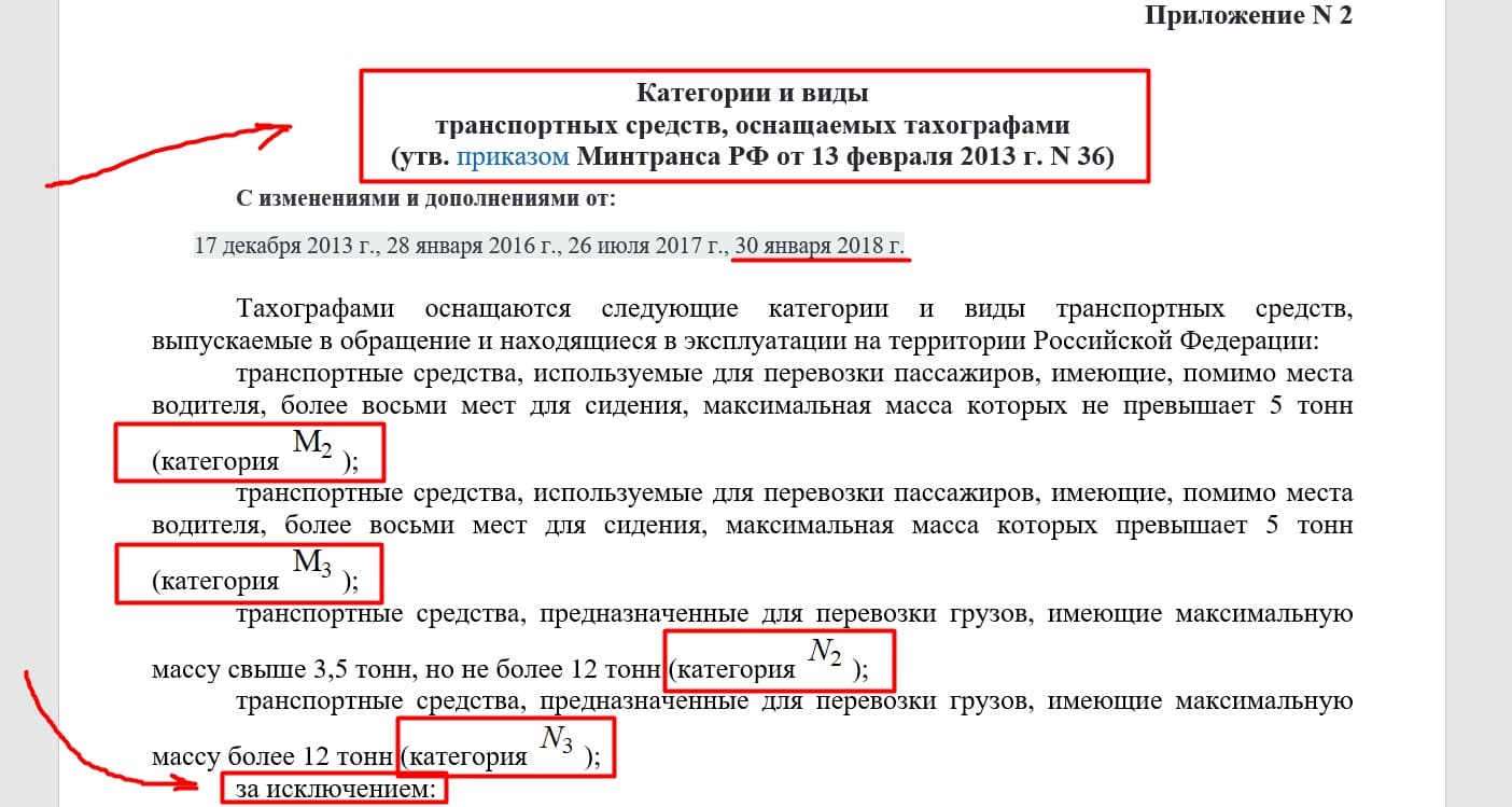 Приложение №2. Категории и виды транспортных средств, оснащаемых тахографами. Цитирую, как есть:
