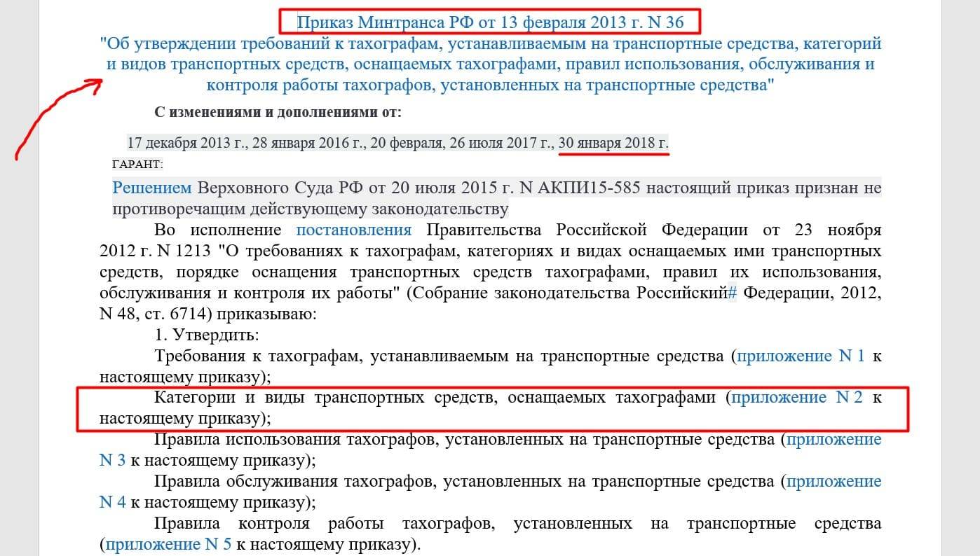 Приказ Минтранса РФ от 13 февраля 2013 г. N 36 «Об утверждении требований к тахографам, устанавливаемым на транспортные средства, категорий и видов транспортных средств, оснащаемых тахографами, правил использования, обслуживания и контроля работы тахографов, установленных на транспортные средства»