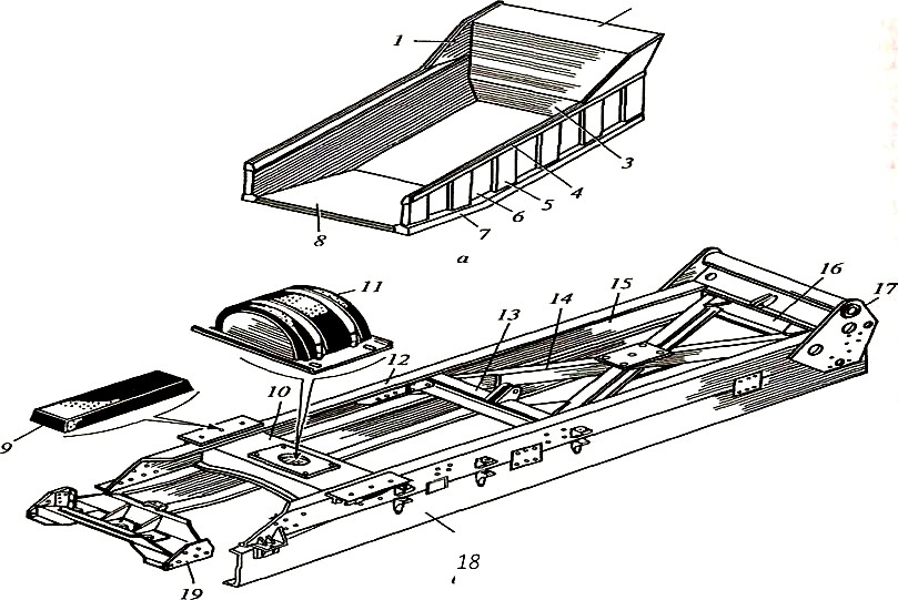 Рисунок 7 – Грузовой кузов (а) и надрамник (б) самосвалов КамАЗ: 1 – боковина; 2 – козырек; 3, 6 – борта; 4, 7, 14, 15 – усилители; 5 – стойка; 8 – основание; 9, 11 – опоры; 10, 13, 16, 19 – поперечины; 12 – лонжерон; 17 – кронштейн; 18 – рама