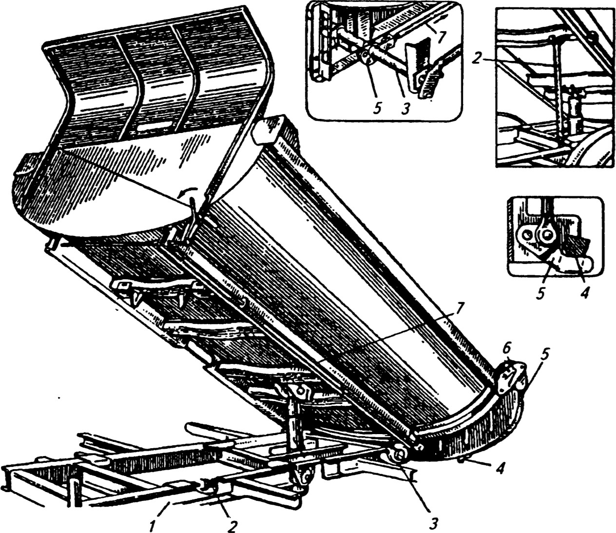 Рисунок 8 – Кузов самосвала: 1 – продольная балка; 2 – упорная штанга; 3 – ось опрокидывания; 4 – цапфа; 5 – запорный крюк; 6 – ось подвески заднего борта; 7 – тяга