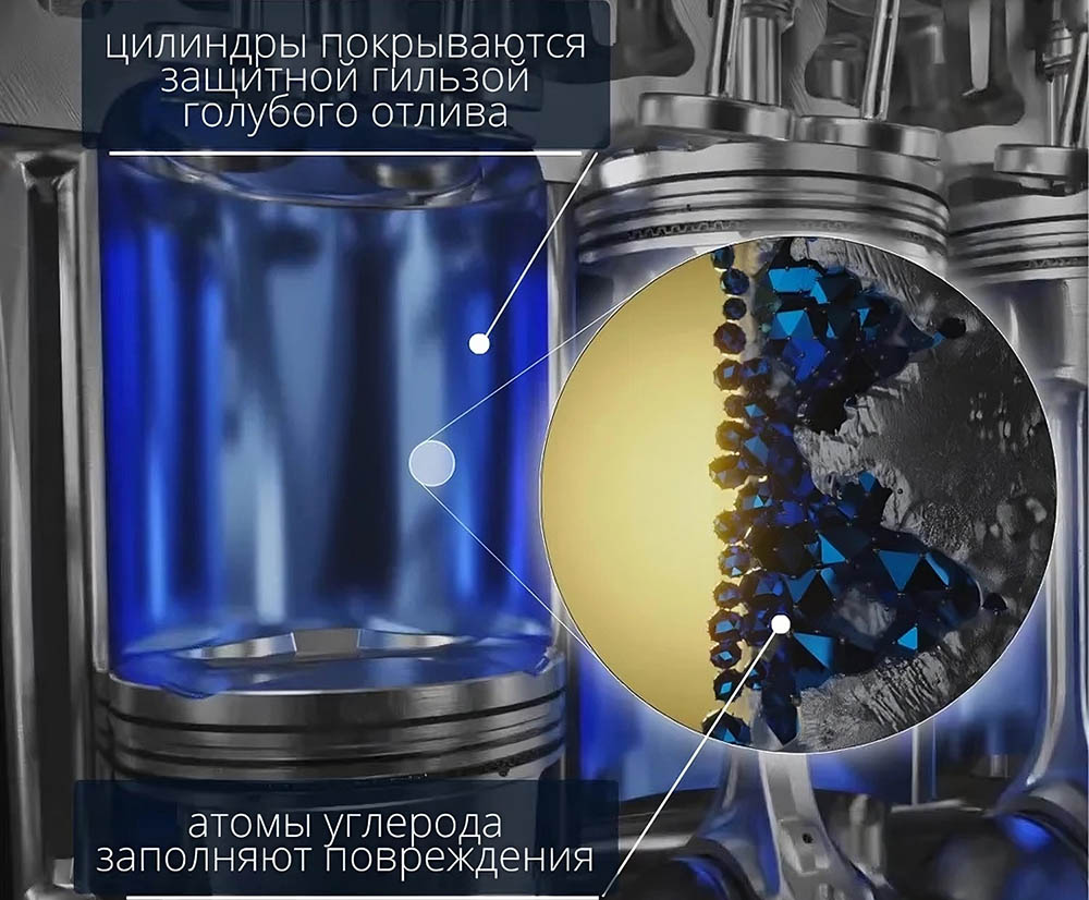 При достижении определенного давления и температуры в двигателе (критическое состояние для трения), на поверхности металла образуется молекулярный ворс, мягко улучшающий антифрикционные свойства моторного масла.