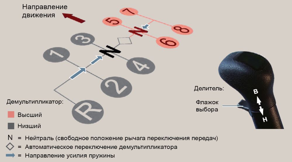 Схема переключения КПП ZF Ecomid и Ecosplit на грузовых автомобилях КАМАЗ это так называемая «двойная Н». Т.е. есть пониженный (S) и повышенный (L) диапазон передач. В каждом диапазоне по четыре базовых передачи, которые расширяются за счет делителя и демультипликатора. Возвращение рычага в «нейтраль» после выключения передачи происходит автоматически за счет того, что рычаг прижимается в нейтральное положение пружинными фиксаторами. Демультипликатор из L диапазона (ряд 3/4) в S (ряд 5/6) и обратно, так же переключается автоматически по средствам подачи воздуха под давлением в рабочий цилиндр. Включить новую передачу можно только после того как будет завершен процесс предыдущего переключения. Задний ход и пониженная передача (С) доступна только в пониженном (S) диапазоне демультипликатора. Включение этих передач идет через небольшое усилие, т.к. там установлена предохранительная пружина, которая исключает возможность случайного выбора одной из этих передач.