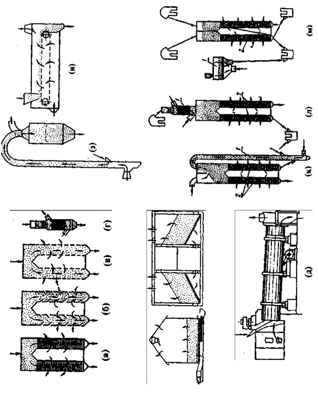 Рис. 2 Конструкции сушильных камер: а — шахта с воздураспределительными коробами; б — шахта с жалюзийными стенками; в — шахта с сетчатыми стенками; г -шахта с тормозящими элементами; д — барабан; e — силос с сетчатым днищем; ж — камера с решетчатым днищем; з — пневмотруба; и — контейнер сетчатый; к — пневмотруба с шахтой; л — камера с падающим слоем зерна и шахта; м — камера с псевдоожижениым слоем зерна и шахта.
