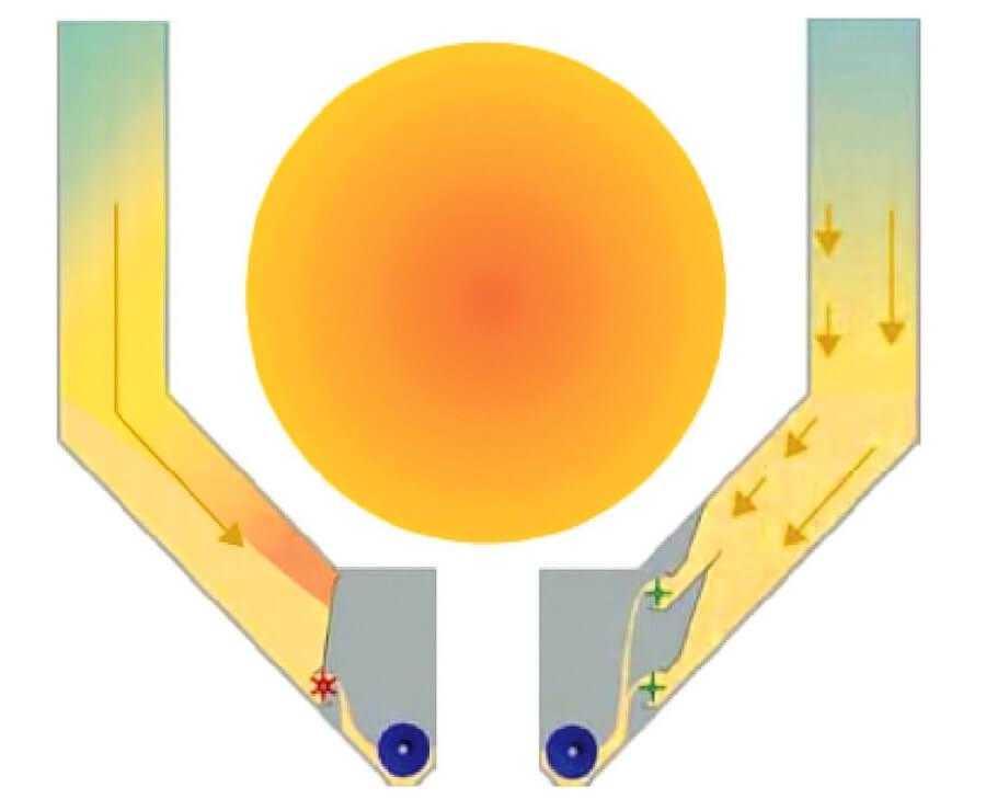 Рис. 8. Система разгрузки зерна американской модульной зерносушилки. Слева – без компенсатора разности температурных режимов сушки. Справа – с компенсатором (один из видов)