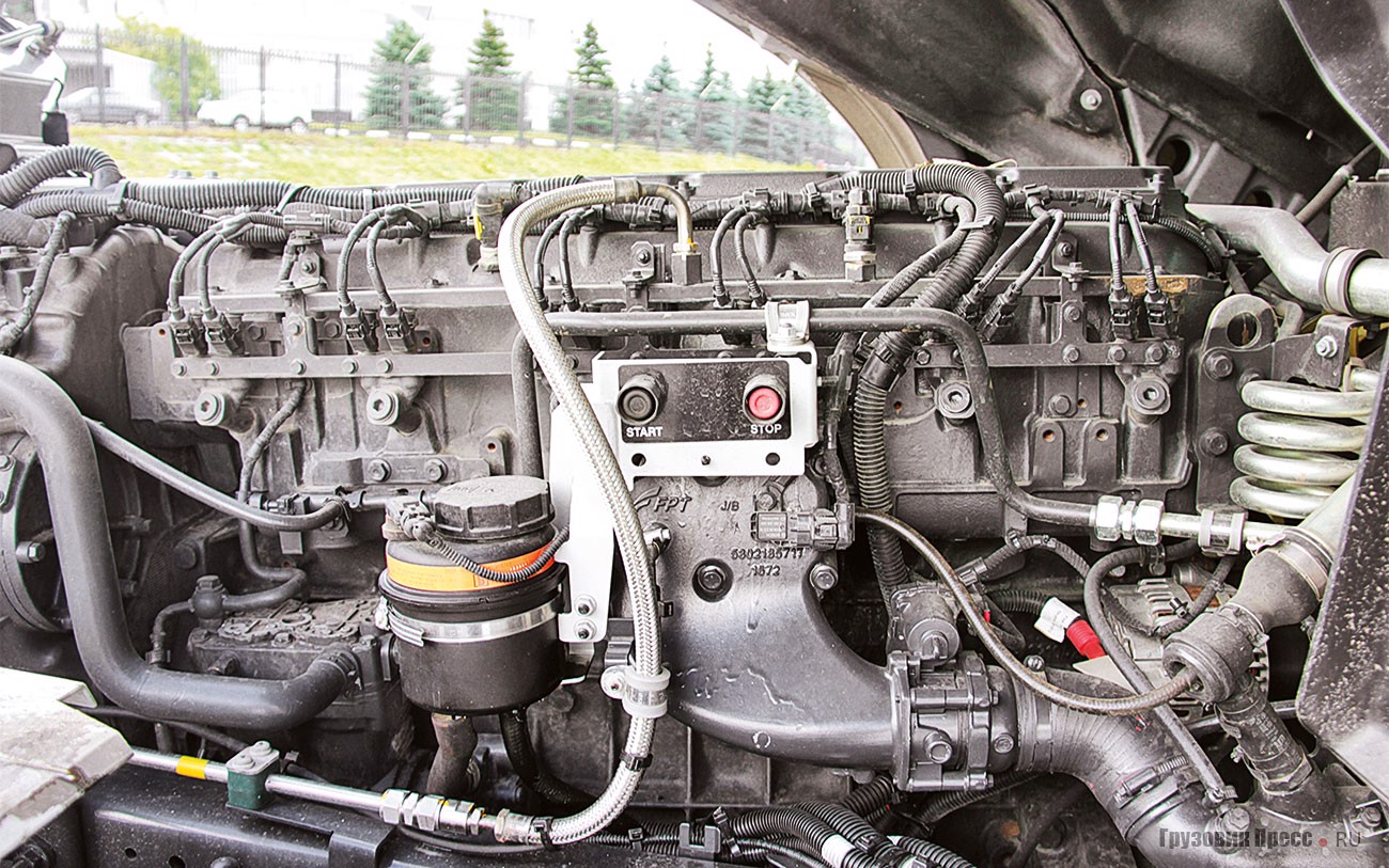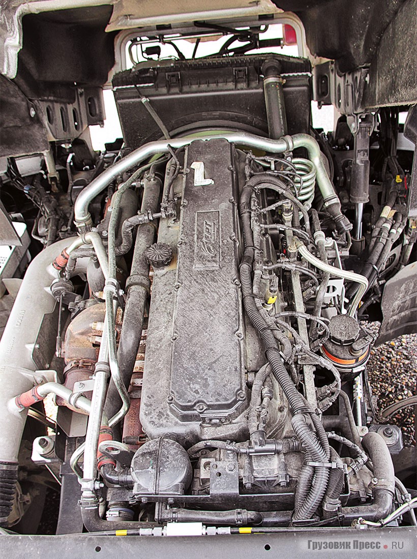 Установленный на нашем тракторе двигатель Cursor 10 (F3AE0681) объемом 10,3 л благодаря турбине с изменяемой геометрией развивает максимальный крутящий момент 1900 Н•м уже при 500 об/мин. Это позволяет трогаться без заметных усилий даже на тягаче с загруженным до полной массы полуприцепом. Дизельный двигатель с низкими оборотами легко набирает скорость. Менять надо уже на 1500–1600 мин–1, дальше «крутить» смысла нет. Уже на таких оборотах двигатель легко берет овердрайв и снова набирает обороты без задумчивых пауз.