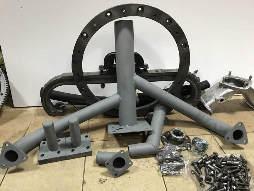 Плавность хода обеспечивается рессорами с профилем половины эллипса, прикреплёнными к передней паре колёс. Вторая пара установлена к базовым конструкциям жёстко. Импульс силовой установки ведущим колёсам передаётся валом кардана.