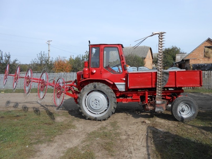 Имеет огромный набор дополнительных съемных приспособлений: устройство для кошения сена, компрессор, погрузчик мелкого габарита, упаковщик стогов, опрыскиватель.