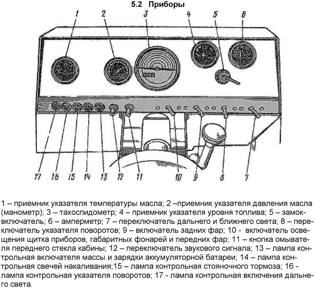 - для контроля на переднем щитке находятся сигнальные лампы, переключатели системы электрооборудования и контрольные приборы.