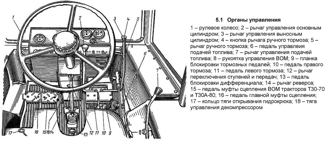 - для управления используются 2 рычага, рулевая колонка и ножные педали. Колонка расположена под небольшим углом в 70°, внутри нее проходит рулевой вал, на верхней части которого укреплено рулевое колесо;