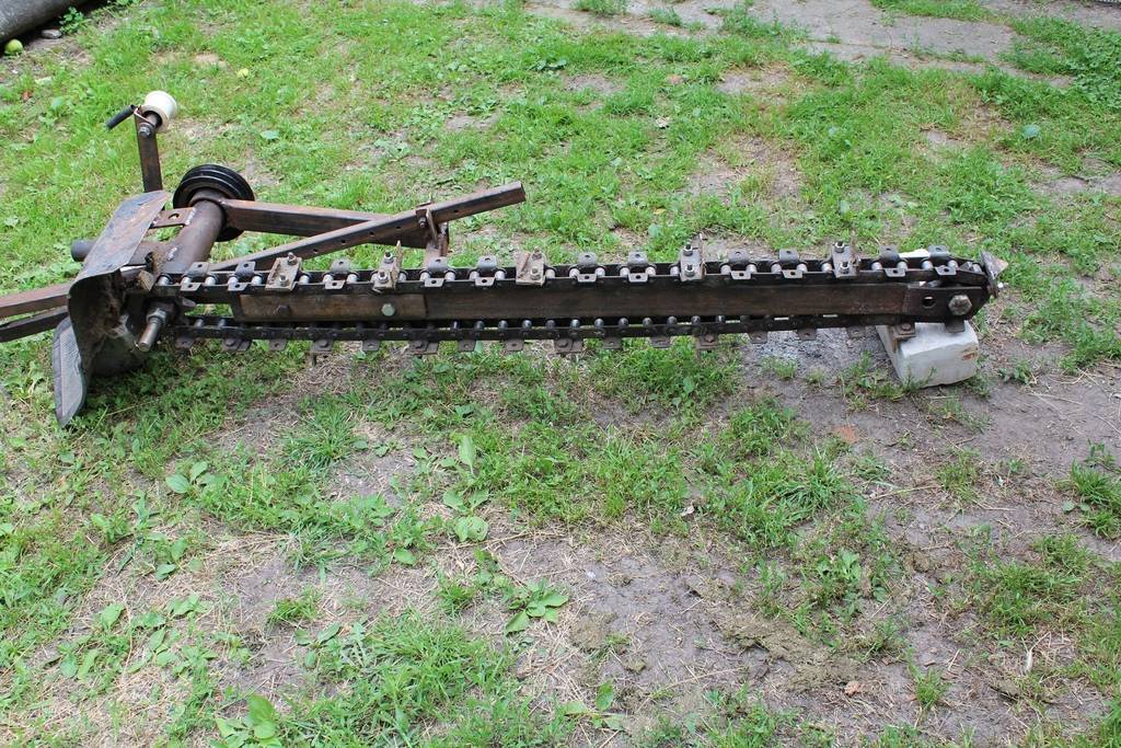 - Наиболее распространён траншеекопатель, который работает на основе использования цепи. Этот инструмент по внешнему виду очень похож на гигантскую бензопилу траншеекопатель. Такой инструмент пила отлично подходит для использования в сельской местности. Оборудование может быть применено вместе с популярными в России марками мотоблоков: Нева, МТЗ, Агат, Ока и некоторыми другими.