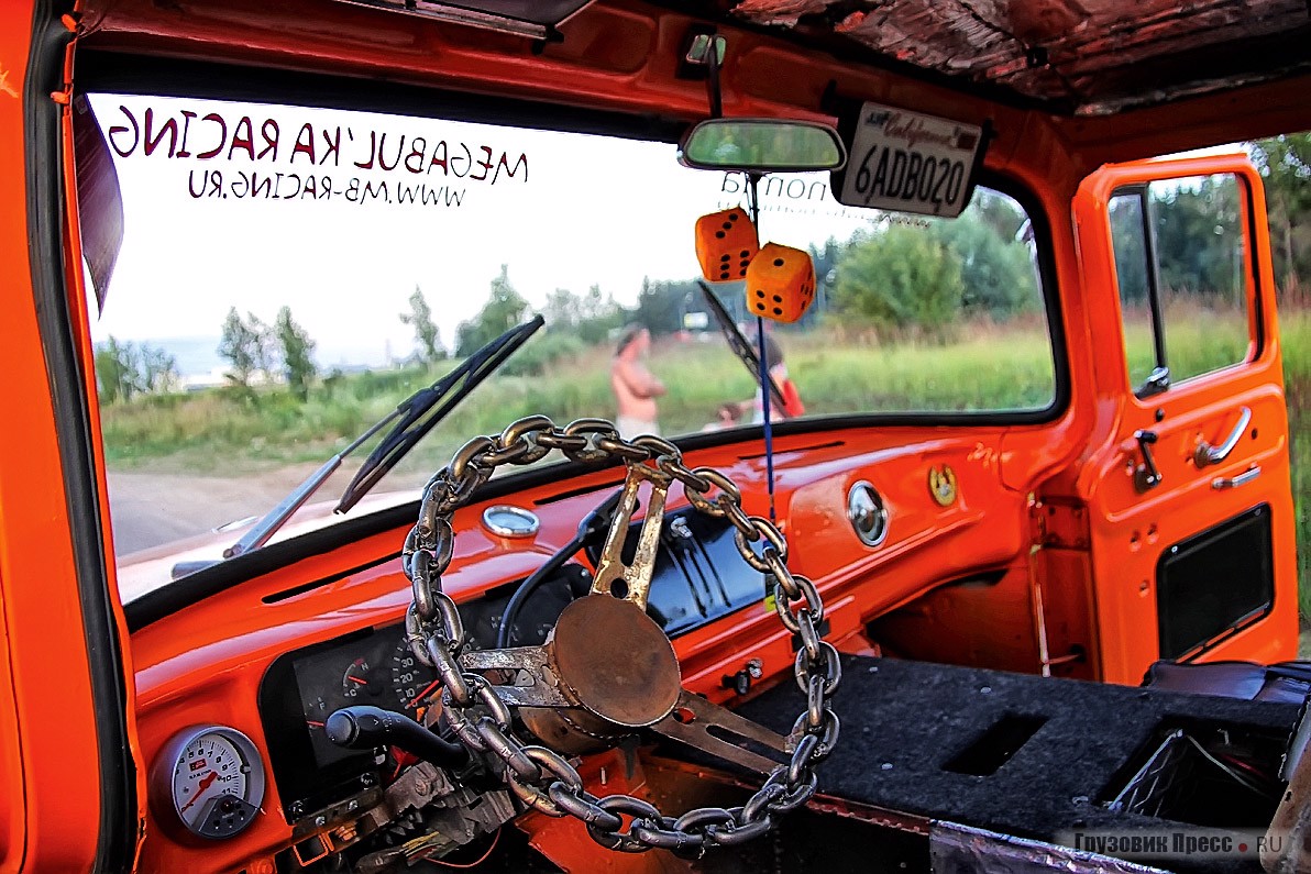 Приборный щиток взят от американского донора, с него снято стекло и изменены размеры корпуса под Зиловскую панель, после чего была вырезана защита из плекса, и вся конструкция установлена на штатное место в кабине ЗиЛа. Передний бампер самодельный, своеобразных угловатых форм. Основа бампера – пространственная сварная конструкция из трубы квадратного сечения, обшитая листовым металлом.