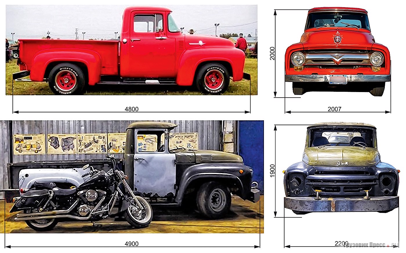 И ещё одна особенность. Один из основных этапов проекта – укорачивание рамы. Основная причина – автомобиль строится для себя, для получения удовольствия. А с длинной базой всё-таки негатив всплывает, так как это довольно длинная и неповоротливая машина, чтобы выехать из гаража, нужно сделать очень много перестановок. Итак, снят кузов, кардан, бак, магистрали. И после изменения пропорций автомобиль приобрёл новый вид. Дальше приведу сравнение габаритов, а также двигателей ЗИЛа и прообраза – Ford F100 1956 г.
